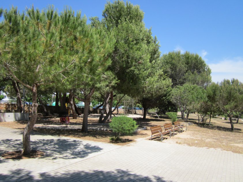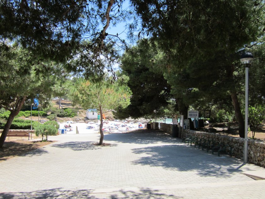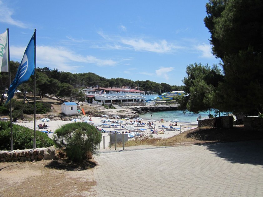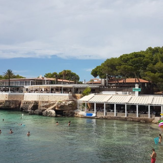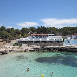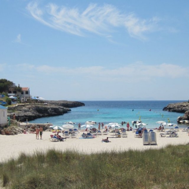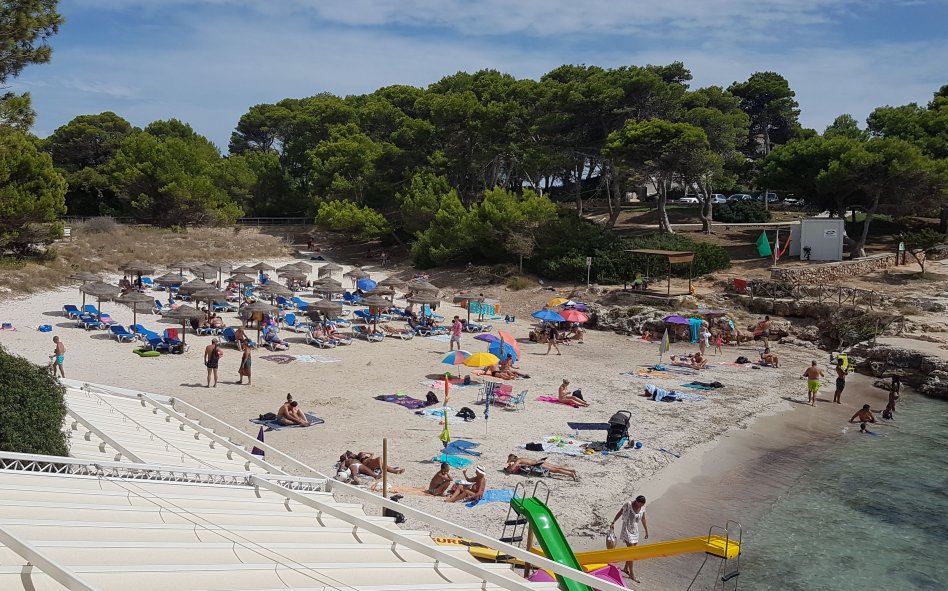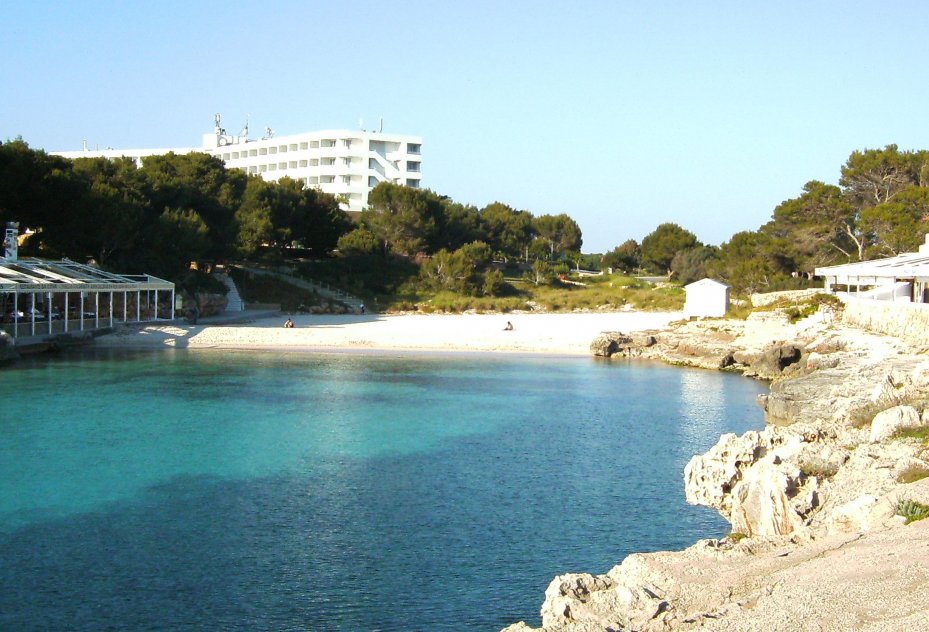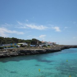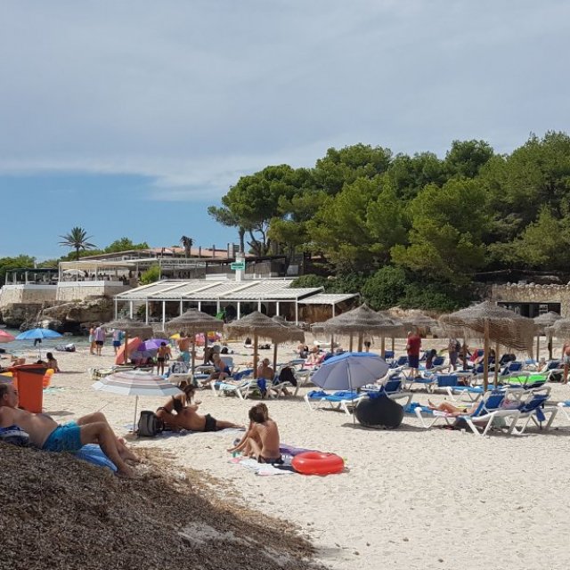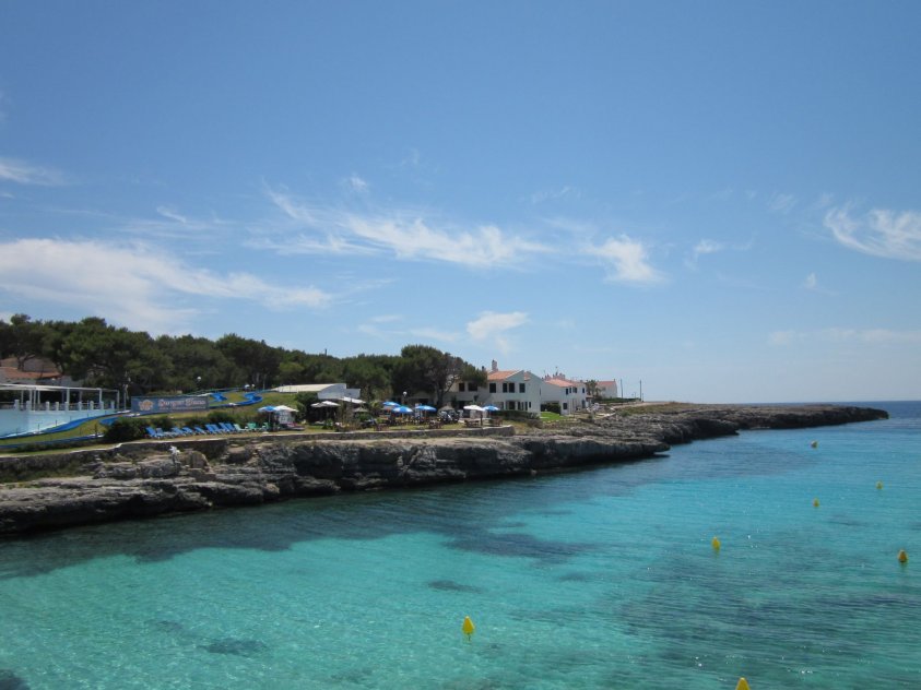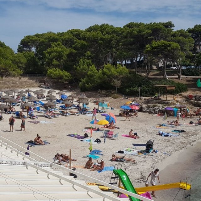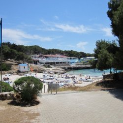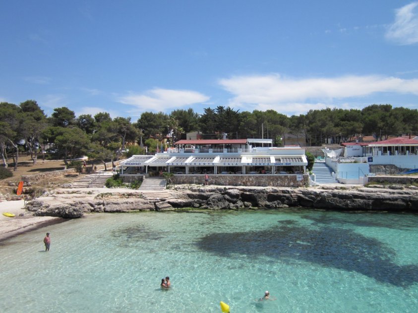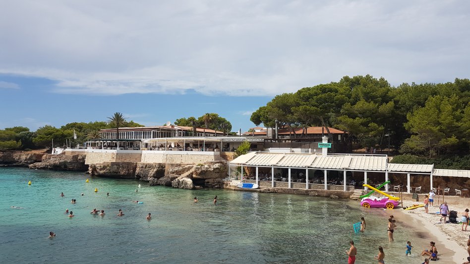 Plenty of beach side restaurants and nearby shops. Small childrens water play area alongside the beach. This is the beach at the southern end of Cala Blanca resort - at northen end is Cala Santandria beach.