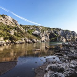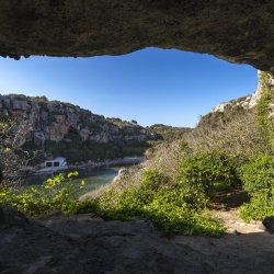 There is a Talayotic era necropolis with over ninety burial caves and hypogeums hewn into the cliffs of the cove, a prehistoric jetty, a coastal establishment enclosed by a prehistoric wall, and a sanctuary dating from the Roman era.