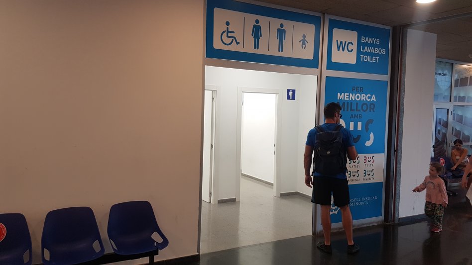 AC, Modern Toilets, vending machines with drinks and snacks....but leave by the sidedoor and there are really good local bakeries eg Can Andres 2 for great fresh Bocadillos + drink ( left ,10 meters ) and mini supermarkets selling fresh fruit and they are all so close you won't miss that bus!